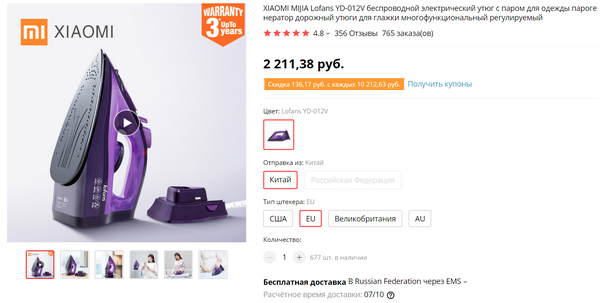 XIAOMI MIJIA Lofans YD-012V - беспроводной электрический утюг с паром. Очень прикольно, я беспроводных утюгов еще не видел. Жене гладить проводным утюгом явно неудобно, провод мешает. Ну вот этот и потестируем, обязательно отпишусь потом по результатам. Но Xiaomi Mijia меня пока ни разу не разочаровывали, насколько я помню.