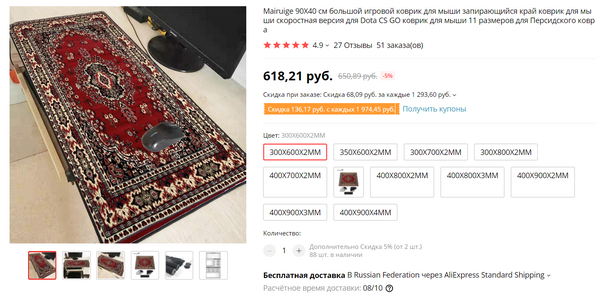 У китайцев обнаружил прикольную штуку: это вам не какой-то коврик для мышки, это целый персидский ковер для мышей! Минимальный размер - 30х30 см, а есть и нормальный такой коврище аж 40х90 см, причем есть еще и толщиной от 2 до 4 мм. Мышке точно будет вольготно.