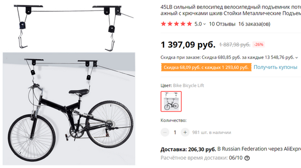 Это я для себя для гаража искал и нашел - может, кому-то еще пригодится. Потолочный подъемник для велика. Мои домашние на велосипедах ездят редко, подвешу их велосипеды к потолку, чтобы место не занимали.