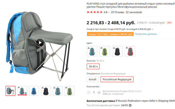 Ну и последняя штука в этом выпуске - рюкзак для походов/рыбалки с табуретом. Мне оно совершенно точно без надобности - ввиду отсутствия походов и рыбалок, - но, может, кому пригодится.