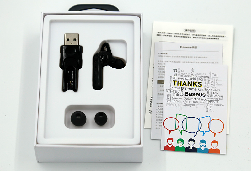 В комплекте: гарнитура, крэдл под USB, инструкция, три насадки-затычки разных размеров - чтобы четко подогнать под ухо.