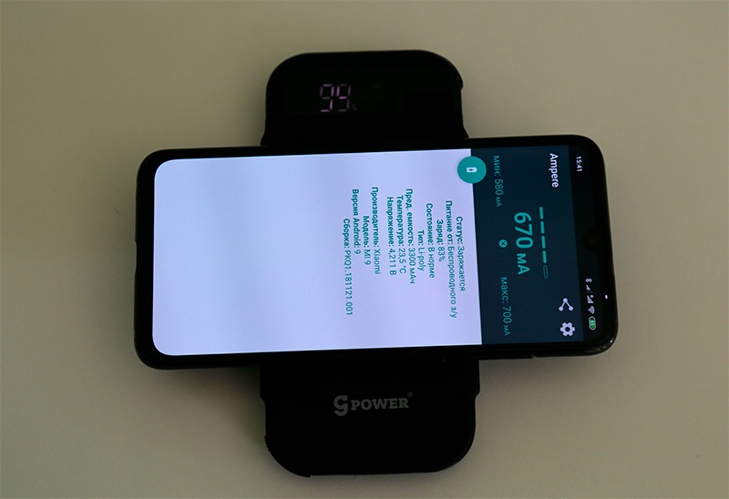 По беспроводной зарядке мой Xiaomi Mi 9 заряжался на 5В/1А, что вполне неплохо. Вот он заряжается на 670 мАч - это при 83% заряда.