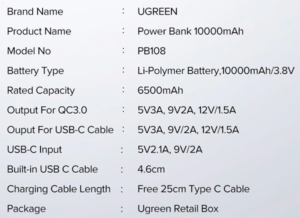 В моей коллекции внешних аккумуляторов пополнение - вот такой симпатичный внешний аккумулятор от производителя Ugreen. 10000 мАч, 9В/2А (то есть 18 Ватт), поддержка Quick Charge 3, встроенный кабелек c Type-C,  второй выходной порт USB-A, входной порт USB-C, может заряжать два устройства одновременно. Сам также заряжается на 18 Ваттах от соответствующего адаптера, полная зарядка с нуля - за 3 часа. Весит 222 грамма.