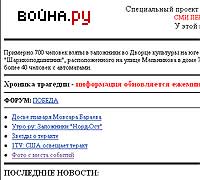 И тогда на помощь пришел Интернет. Выяснилось, что в Сети следить за событиями гораздо удобнее, причем по многим причинам. Во-первых, в наиболее известных и уважаемых новостных изданиях (Lenta.ru, Gazeta.ru) информация более-менее тщательно отбиралась и давалась в виде статей с действительно важной информацией. Во-вторых, было организовано несколько сайтов, где  в режиме постоянного обновления информации давались все новости, факты и сообщения, появлявшиеся на телевизионных и  радиоканалах. Самый лучший, быстрый и удобный, на мой взгляд, был проект Voina.ru, который был придуман и создан еще во время трагических событий 11 сентября прошлого года известным новостным изданием Dni.ru (напоминаю, что во время сентябрьских событий Dni.ru практически единственные оказались на высоте: они сразу убрали с сайта всю лишнюю на тот момент информацию, отказались от баннеров и графики и стали давать хронику событий в виде голого текста html, который, к тому же, верстался руками, что позволило этому сайту практически единственному выдержать тот огромный поток посетителей, который тут же устремился на новостные издания за информацией; тогда же создатели Dni.ru создали проект Voina.ru, который специально предназначался для отслеживания подобных событий). Кроме Voina.ru еще на нескольких изданиях давалась лента новостей, но лично мне Voina.ru показалась наиболее удобной. В-третьих, в Интернете есть сайты так называемой "гражданской поддержки", где создатели основной упор делают на свободный обмен информации от граждан к гражданам, а также поиск и предложение помощи. Самый известный и самый посещаемый сайт из этой серии - проект Vazhno.ru.