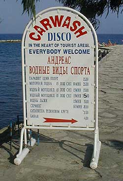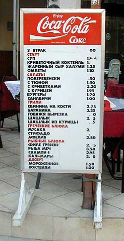 Но возвращаясь к надписям... Похоже, что для создания немеркнущих строк русского меню киприоты не всегда прибегают к помощи истинных носителей русского языка, в результате чего на свет появляются следующие шедевры, которые вы видите на снимках.