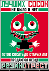 Впрочем, оставим всякие социальные мотивы. Там и без этого есть масса всяких интересных плакатов, некоторые из которых и сейчас можно повесить в любом учреждении или даже в квартире. Вот, например, совершенно прелестный плакат с невероятно радостным слоганом: "Лучших сосок не было и нет, готов сосать до старых лет". Это, между прочим, реклама "Резинотреста".
