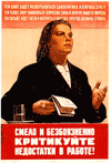 Некоторые плакаты - весьма и весьма интересны. Например, плакат, на котором изображена щекастая женщина на трибуне, снабженный крупной надписью: "Смело критикуйте недостатки в работе"! Сейчас мы уже не очень-то знаем, что тогда означала эта загадочная фраза. Как это - смело критикуйте? Что за бред? А в старые времена никому не приходилось объяснять, кого именно можно и нужно критиковать и за какие недостатки! Дворника можно было критиковать - да сколько угодно! Снег не весь убрал, двор не подмел, мусор рассыпал. Пьющих сантехников можно было гнобить хоть сутки напролет. С некоторой осторожностью можно было покритиковать мастера участка. Особенно если тот был беспартийный. Потому что если партийный, то мастера критиковать уже было нельзя. Ведь таким образом критика бросала тень на всю Партию. А ее за что критиковать? Она безгрешна, как мадонна с ребенком.