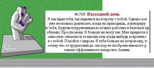 После этого я некоторое время постоял рядом с только что выполненным памятником и отправился по своим делам, полностью освобожденный от мысли хоть когда-нибудь отдохнуть. Что ж, одной невыполнимой идеей стало меньше. Это не может не радовать...