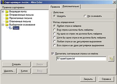 Кстати, напоминаю, что счастливым обладателям TheBat!'а достаточно просто перенести этот список на свой компьютер, чтобы фильтр "Выборочное скачивание" прямо по этому списку убивал спамерские письма на сервере. Для этого достаточно в выборочном скачивании просто создать фильтр с настройкой "Определять по заголовкам", а в закладке "Дополнительно" указать "Прочитать сигнальные строки из файла" и ввести название этого файла. После этого раз в неделю копируете мою антиспамерскую коллекцию к себе на компьютер, и ваши волосы будут светлыми и шелковистыми, а почта - проникновенной и личной, безо всяких гнусных и непристойных спамерских предложений. Если у вас несколько ящиков, сделайте такой фильтр для всех них - это очень удобно. Один раз создаете фильтр, а далее только раз в неделю обновляете список с моего сайта.