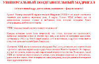 Хорошие люди В. Руднев и Г. Селегей предлагают нам, дорогие мужчины, шикарный сервис под названием "Универсальный поздравительный мадригал". Его можно использовать для любого поздравительного действа, обращенного к любому лицу любого женского пола по любому поздравительному поводу. Особенно удобно мадригалом сопровождать какой-нибудь подарок, который вы вручаете любимой (жене, родственнице, коллеге по работе, начальнице, управдому, секретарше, медсестре, налоговой инспекторше, любовнице, учительнице сына и так далее), причем чем проще подарок, тем изысканнее должен быть мадригал. Если же вы осмеливаетесь в качестве подарка использовать лотерейный билет за пять рублей или календарик с изображением Димы Маликова, тогда мадригал по степени изысканности должен превзойти брабантские кружева в ананасах, залитые шампанским.