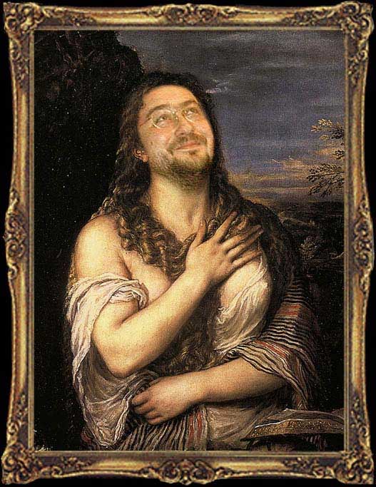 На форуме Экслер.Ру (сегодня он уже не первый раз упоминается, но что поделать, люблю я этот клуб для общения) открыта галерея работ прекрасного художника и дизайнера Татьяны, которая называет себя Image. Татьяна берет физиономии некоторых форумных завсегдатаев и монтирует их в известные художественные произведения. Получается нечто потрясающее. Обязательно загляните и полюбопытствуйте - это, как говорится, что-то особенного! Вот вам, к примеру, картина, изображающая любимца форума, человека с большой буквы "С" - Антония Соколовского в позе кающейся Магдалены. (голосом экскурсовода) Посмотрите, какой мольбой полны эти шкодливые глаза! Каким смирением веет от этой хитрой физиономии!..