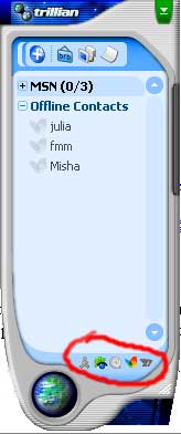 Снизу красным обведены пиктограммы различных мессенджеров (ICQ стоит вторым). Так что все у вас получается как у "Хэд энд шолдерс" - в одном флаконе, что может быть весьма удобным. Я с этой программулькой денек поработал - вроде, понравилось, хотя себе ее ставить не буду (я в основном общаюсь только через ICQ, так что мне нет смысла городить огород). Но данный сервис очень полезен для тех, у кого абоненты используют разные системы.