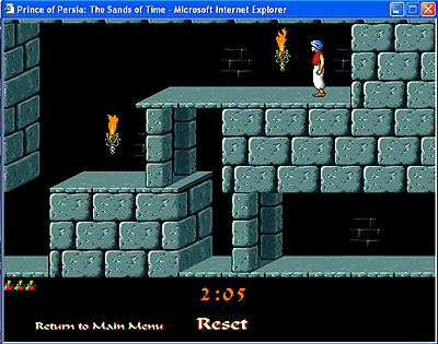 К чему это все? К чему ностальгические воспоминания? А к тому, что в "Принца Персии" теперь можно поиграть и в Интернете. Заходите на сайт Princeofpersiagame.com, нажимаете на ссылочку arcade, после чего наслаждаетесь кусочком этой шикарной игры прямо в Интернете. Все очень реалистично и выглядит так, как в те благословенные времена. Причем это не точный повтор старых уровней, а нечто новое. Честно говоря, я не знаю, сколько там уровней и удастся ли вам освободить эту дуру, но важен сам процесс, ведь правильно?