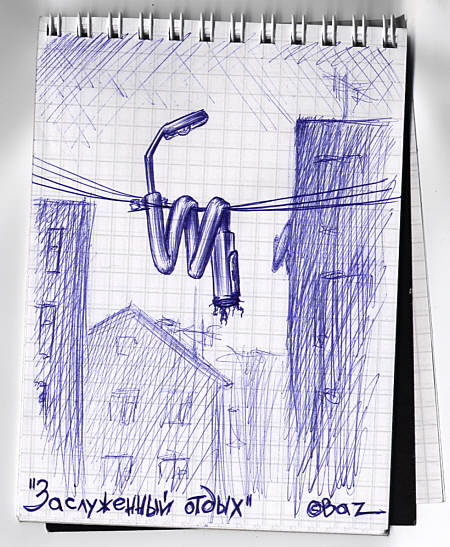 Рекомендую очень симпатичные рисуночки от кота Базилио. Насколько я понял, рисунки делаются на обычных листах бумаги, а потом сканируются. Мне очень понравилось. И юмор хороший, и техника рисования вполне профессиональная. Посмотрите, например, какая прелесть (кликнув на картинку, вы попадете на список галерей):