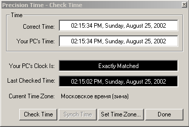 Вместе с этим Date Manager'ом также отдельно была установлена маленькая программка Precision Time (программа создана той же фирмой Gain, которая сделала Date Manager). Она, в соответствии с заданными настройками, сверяет системную дату вашего компьютера с "атомными часами" и выставляет системный таймер с точностью до сотых долей секунды, причем может это делать автоматически (я поставил автоподвод каждый день) либо вручную. Выглядит это примерно так (в ручном режиме):