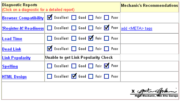 Очень полезная ссылочка для вебмастеров - Web Site Garage. Вводите адрес своего сайта, e-mail, на который следует присылать ругательства, после чего получаете беспристрастный анализ вашей странички (обычно речь идет о главной страничке) по всевозможным категориям. Разумеется, я не удержался и с замиранием сердца отправил свое детище Экслер.Ру на раздраконивание. Дракон пыхнул огнем следующее: