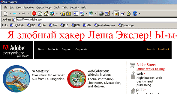 В прошлом выпуске я рассказывал о сайте, с помощью которого можно хакнуть любого провайдера. Сегодня идем дальше. На этот раз знакомимся со злобным сервисом, с помощью которого можно хакнуть любой сервер (вообще любой, независимо от степени защищенности). Причем это никакие не шутки, вроде того, что вам напишут: "Сайт Экслер.Ру хакнут". Хакается все это дело круто! Не верите? Вот посмотрите на скриншоте, как я хакнул заграничный Adobe.Com. Если не верите - нажмите на скриншот и увидите, что моя злобная хакерская надпись там действительно светится (если они к этому моменту не спохватились и ее не убрали).