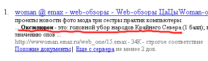 Кроме того, Яндекс теперь научился работать с запросами на естественном языке. Например, интересует вас вопрос - "что такое оксиморон". Вместо того, чтобы извращаться самым противоестественным образом, пытаясь сформулировать свой вопрос так, дабы немедленно получить ответ, вы просто заходите на Яндекс и вводите вопрос так, как он уже прозвучал: