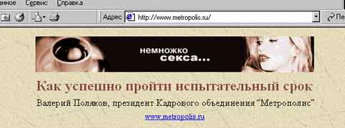 Екатерине Храбровой баннер подсказал способ - как успешно пройти испытательный срок у президента кадрового объединения "Метрополис". Екатерина предложенным способом не воспользовалась, зато поделилась этой тайной с нами.