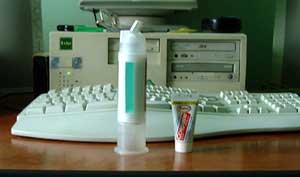 Справа - вы, наверное, уже поняли - стоит обыкновенная зубная паста "Колгейт". Только тюбик с этой пастой в три раза меньше обычного. Почему? Черт его знает. Мы с другом долго гадали, почему в Швейцарии выпускаются такие маленькие тюбики. Из экономии? Вовсе нет, потому что три таких тюбика (равных по количеству пасты обычному) стоят значительно больше одного "нормального". Паста для гномиков - тоже нет, потому что в Швейцарии гномики если и живут, то далеко в горах и на улицах приятель их не видел ни разу. Короче говоря, мы так и не выяснили причину, по которой выпускаются такие маленькие тюбики.