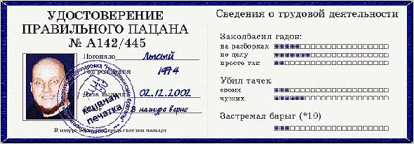 А здесь - так называемое "Удостоверение правильного пацана". Забавная мысль.