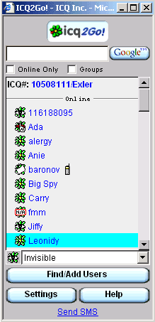 Как с этим сервисом работать? Очень просто. Заходите на go.icq.com и нажимаете на очень заметную ссылочку вверху страницы. После этого вводите свой номер ICQ и пароль (при необходимости сервер вас "запомнит"), а далее получаете веб-окошко с ICQ, которое очень мало отличается от привычного окна ICQ стандартного клиента.