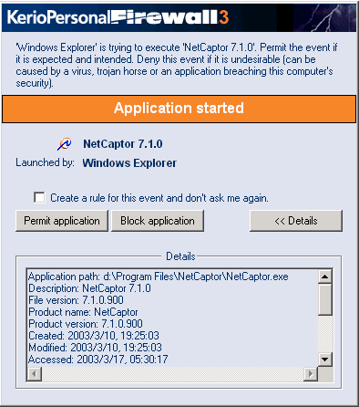 2) Kerio Personal FireWall 3.0 - дальнейшее развитие линейки Tiny Personal Firewall. Shareware, имеет тридцатидневный пробный период. Стоит $39. Функционально он несколько мощнее прародителя - Tiny Personal FireWall, удобнее в использовании и красивее. На нем мы с приятелем и остановились.