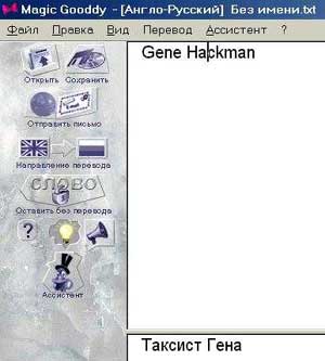 Серег, не расстраивайся! Может, этот магический гуууууди просто перепутал Хэкмена с Зюгановым. Это же дядя Зю у нас - таксист Гена. Точнее, рулевой Гена, ведущий нас в светлое прошлое... Впрочем, эти переводчики - они такие странные... Помню, был у меня на одной работе партнер из Штатов - Glen Scar. Мы с ним переписывались по всяким нашим рабочим делам. И вот в один прекрасный день я письмо от него (оно было, разумеется, на английском) скормил "Сократу". И с удивлением увидел подпись под текстом - "Шрам долины реки". Это "Сократ" Глена так перевел... Я Глену об этой хохме рассказал, тот рассвирепел и попытался перевести слово "Экслер" на английский. И фига с два у него что-нибудь получилось...