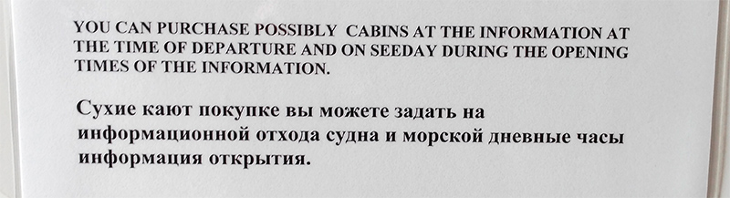 Поразительно хреновый английский для просвещённой Финляндии. Даже для финского паромщика ) Странно также, что на финском пароме, плывущем в Германию, сообщение на английском и русском, но не на немецком.