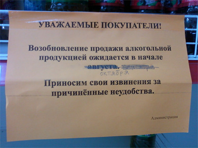 Судя по грамотности объявления, замечает Алексей, они пока сами всю алкогольную продукцию не выпьют, торговлю так и не начнут.