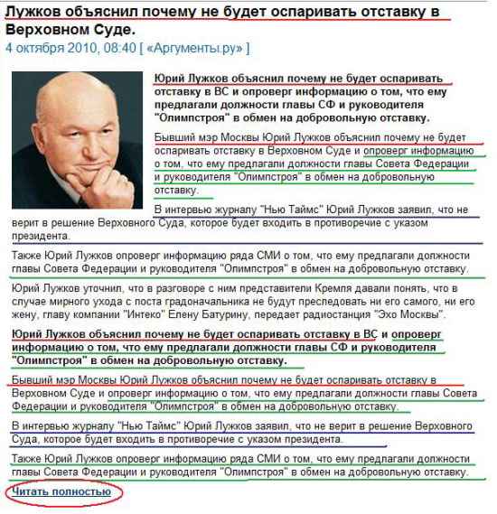 В издании "Аргументы недели", рассказал Андрей, изобрели отличный способ сделать полноценную статью из двух фраз. Надо просто несколько раз нажать Ctrl+C и Ctrl+V - статья готова. А платят ведь построчно...