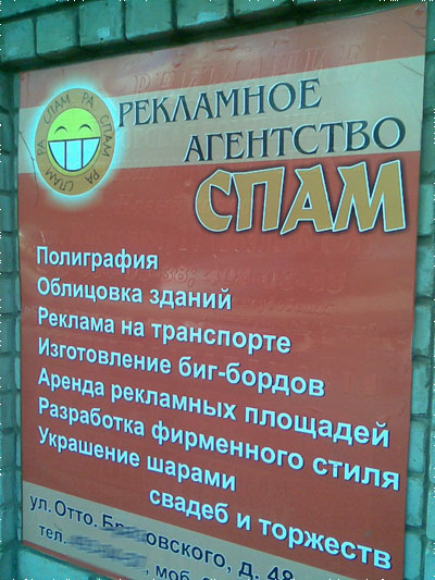 Агентство "СПАМ". Если присмотреться - можно увидеть старый текст под краской. И впрямь - заспамили 😄