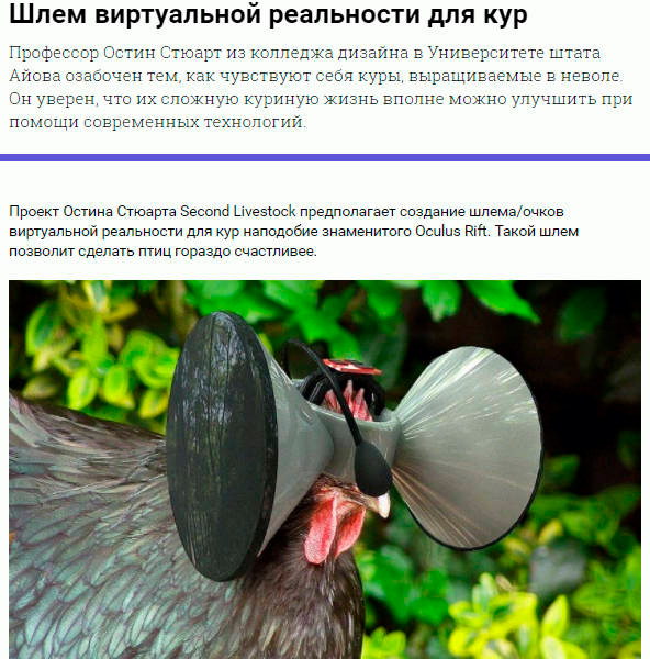 А что - хорошая мысль, считает Анатолий. Вот, например, подсунули в курятник совершенно ледащего петушка. Но у куриц в шлемах виртуальной реальности будет красавец Петя-петушок, золотой гребешок, шелкова бородушка и дорогие шмотки. Для людей, кстати, такая штука тоже должна хорошо сработать.