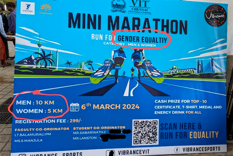Мини-марафон за равенство полов, рассказал Ник. Мужчины бегут 10 километров, женщины бегут 5 километров. Ну, в качестве демонстрации подлинного равноправия.