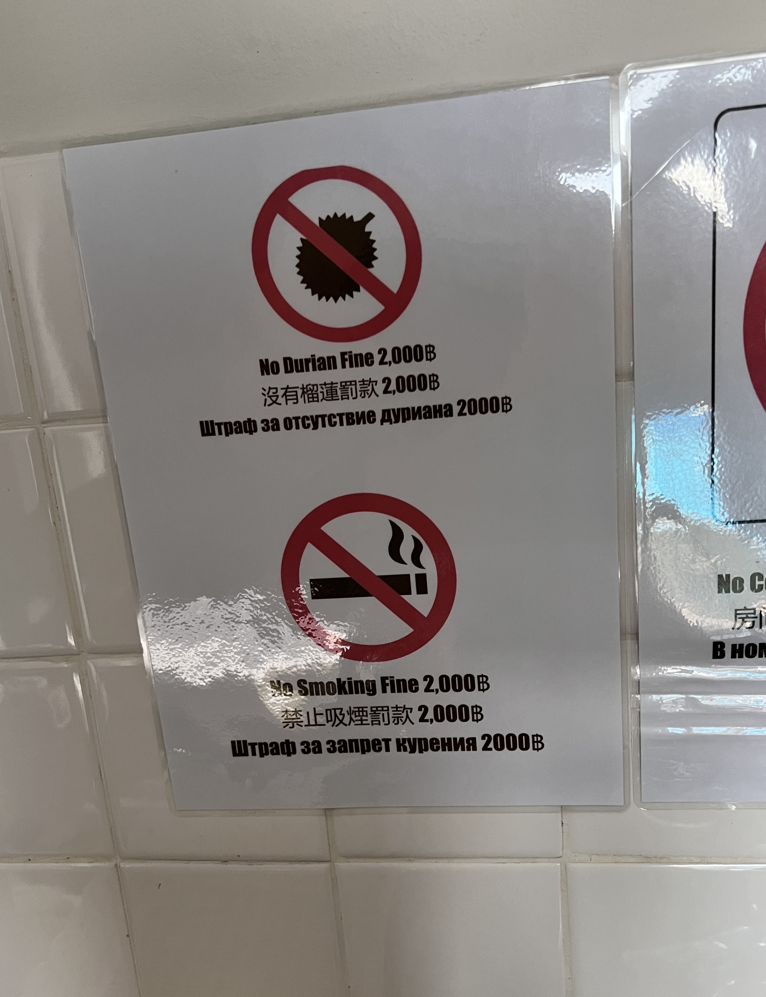 Кстати, на английском, насколько я понимаю, написано то же самое: дуриан иметь с собой, курение не запрещать.