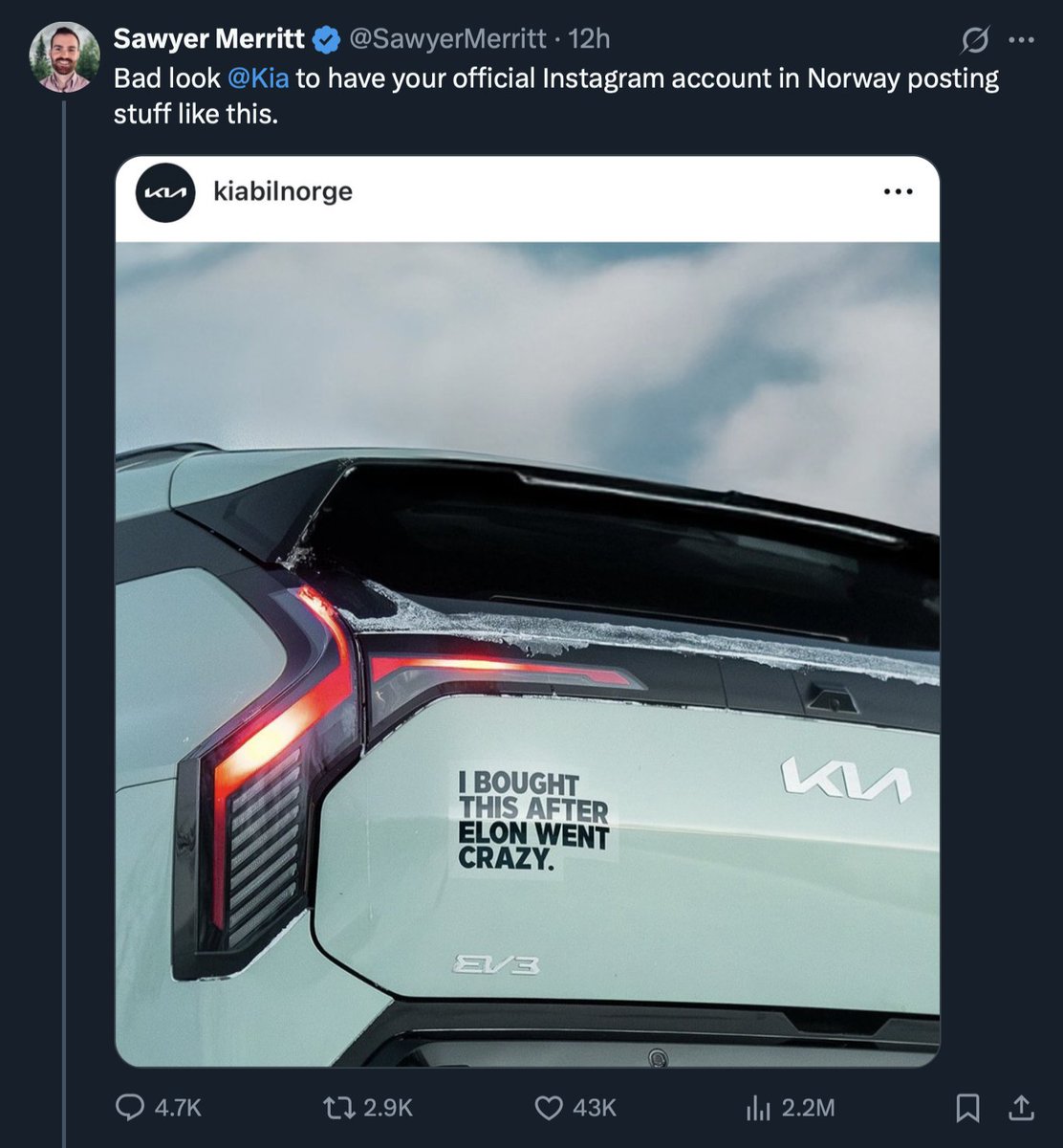 Если кому-то пришлось купить Киа только оттого, что глава Теслы нехороший человек, то Киа хуже Теслы. Сомнительная реклама для Киа, так то.