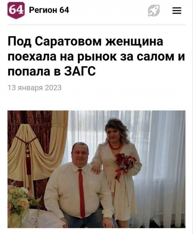 А что, женщина поехала за салом, и в ЗАГСе сало нашла (на картинке же показано).