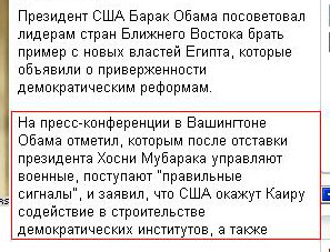 То ли Обама был потрясен отставкой Мубарака, то ли новостист был потрясен отставкой Мубарака, замечает Д.А., но текст новости также потрясает. "Радио Свобода", между прочим.