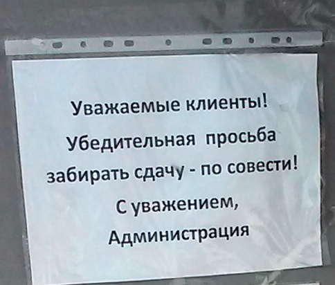 Какой трогательный призыв, умиляется Евгений. По совести - это в смысле не забирать сдачу?