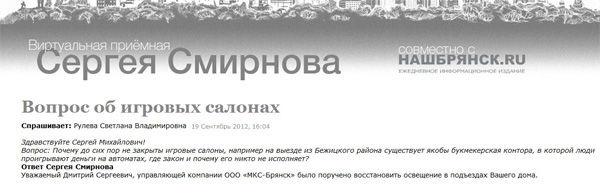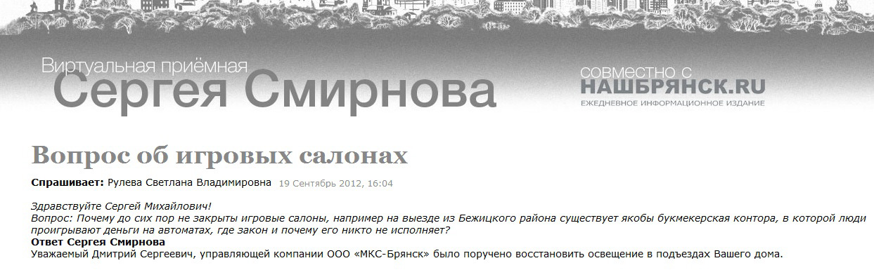 В Брянске глава города, хвастается Сергей, отвечает на вопросы трудящихся в виртуальной приемной! (Кликабельно.)