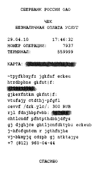 Ник получил в Сбербанке вот такую вот милую квитанцию. Особенно трогательно там смотрится "Спасибо" в конце...
