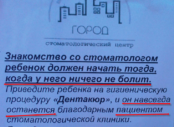 Дмитрий прислал прекрасную рекламу стоматологического центра "Город". Отведите туда ребенка, когда у него все в порядке, - он после этого навсегда останется их пациентом. Не дай бог, на самом деле...
