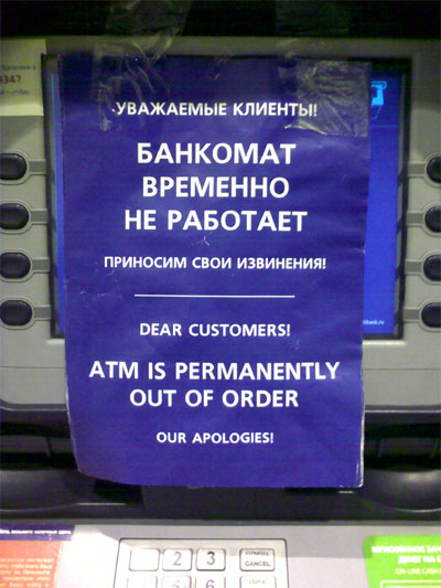Надпись на английском, рассказал Андрей, говорит о том, что автомат вышел из строя навсегда. Но на русском все-таки оставляют какую-то надежду.