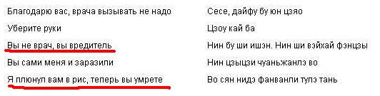 Иван прислал кусочек из русско-китайского разговорника. Подчеркнутые фразы, видимо, особенно актуальны.