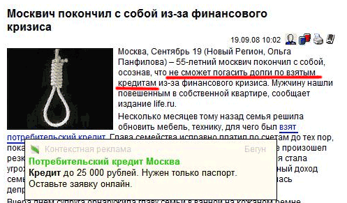 Antropov прислал грустный баннизм, над которым мы, разумеется, шутить не будем, а только еще раз продемонстрируем один немудреный факт: ставить бегунскую контекстную рекламу подобного рода у себя на сайте могут только законченные кретины.