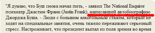 Психиатр Джастин Франк, который настолько хорошо знает Джорджа Буша, что написал его автобиографию, считает, что Джордж снова начал пить, рассказал Roman Faynberg.