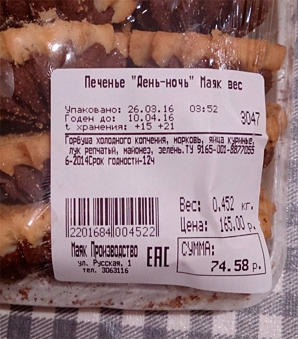 Во-вторых, те, кто его печатал - неужели не прочитали, что на этикетке печенье, а состав от какого-то рыбного салата?