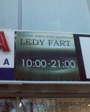 Салон женской одежды "Леди пердёж" - это, конечно, прелестно, но все-таки звучит несколько вызывающе, считает Татьяна. Причем, учитывая особенность написания, это скорее "Ляди пердёж". Но зато с десяти до девяти.