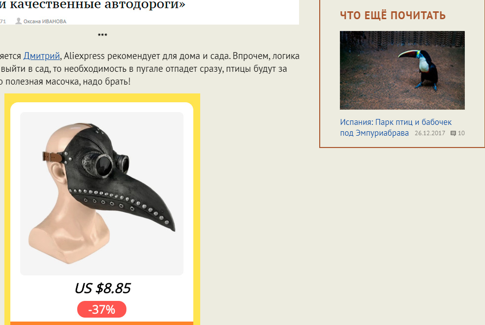 Вот такую штуку, удивляется Дмитрий, Aliexpress рекомендует для дома и сада. Впрочем, логика в этом есть: если в ней выйти в сад, то необходимость в пугале отпадет сразу, птицы будут за версту облетать. Так что полезная масочка, надо брать!