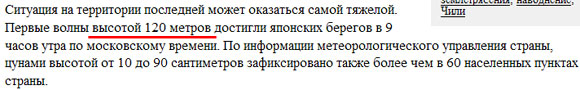 В деловой газете "Взгляд", рассказал VИКТОR, пугают огромными цунами! От 120 метров до аж 90 сантиметров. Но все не так страшно. Есть еще цунами и в 10 сантиметров. Это которые с легкостью можно взбить в ванне.